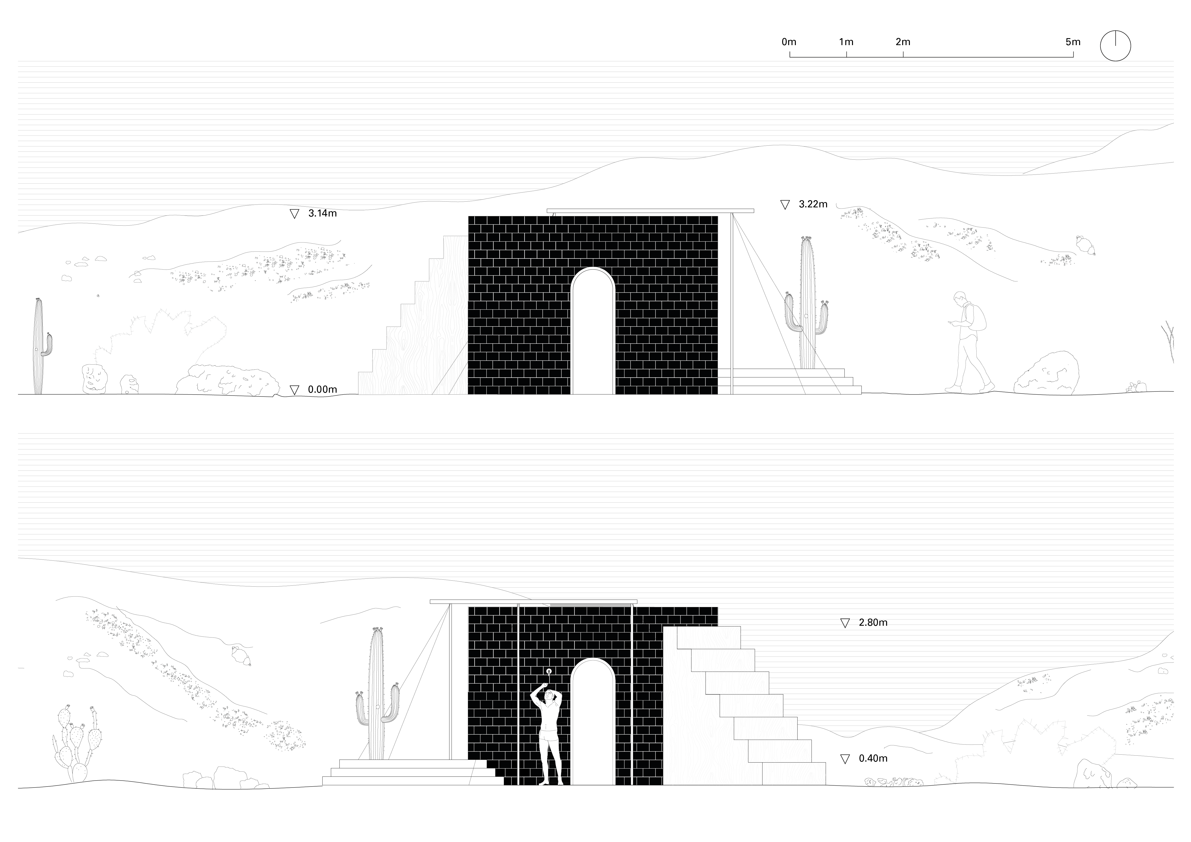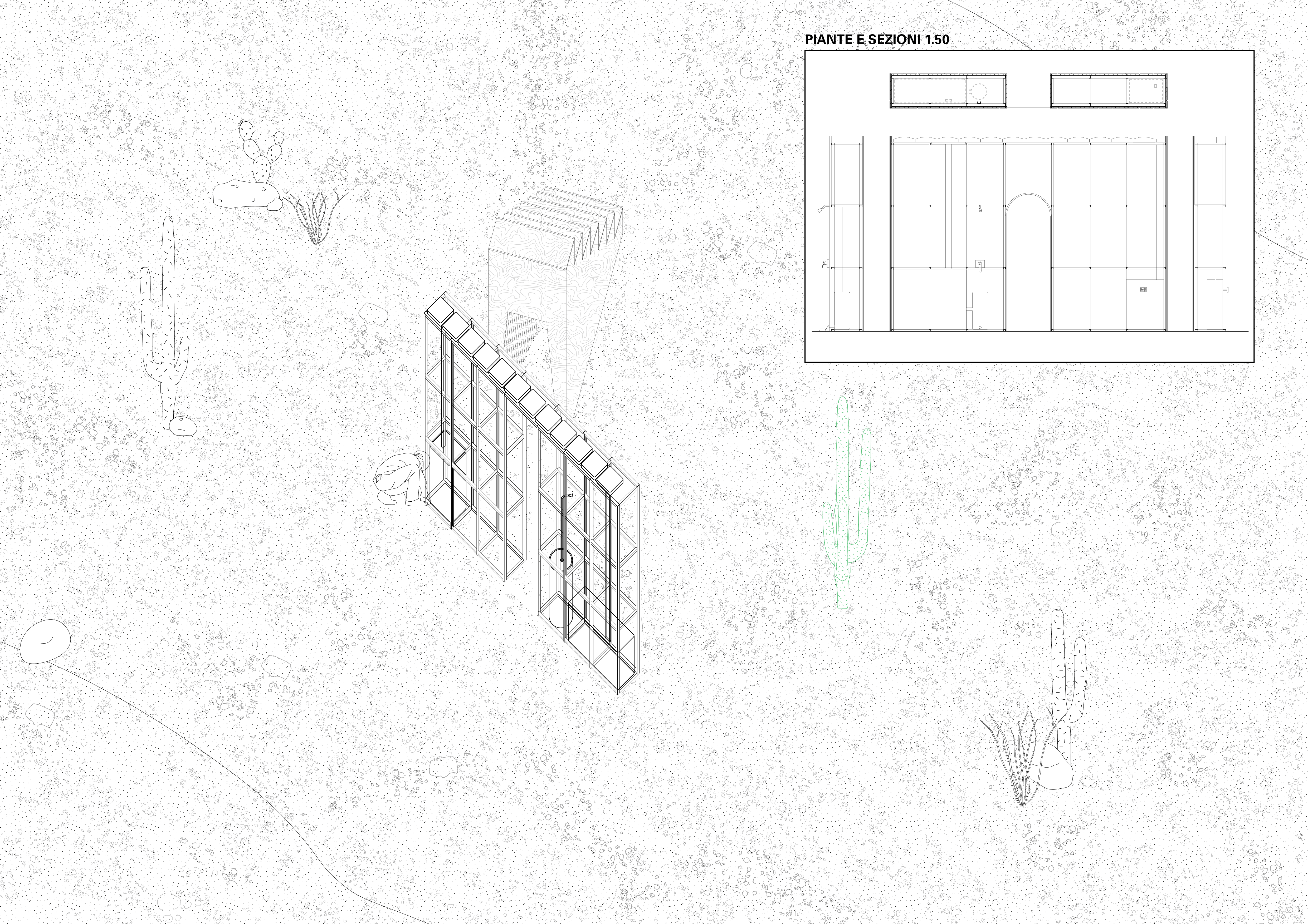 The intevention is a shelter in the desert. The project is a playful tribute to four architectural archetypes. It is a polemical - critical reflection around the difference between function and use.